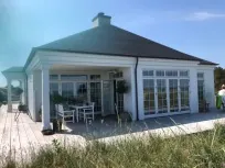 Det elegante hus på Strandvej 104 er af hensyn til blandt andet terræn og udsigten mod Kattegat sammensat af flere bygningskroppe med varieret højde og drøjde.Samspillet med klitterne giver huset karakter af, at det ligesom ”vokser” ud af terrænet med en spændende fremtoning, som gør det helt forskelligt fra de mere gængse rektangulære 1-plans huse. Det er et både iøjnefaldende og spændende byggeri, som er tildelt et diplom.